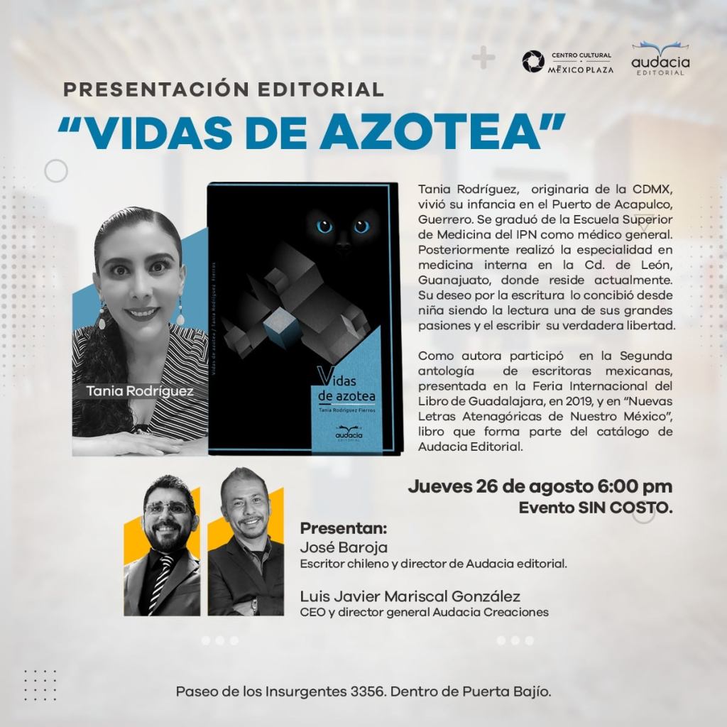 El 26 de agosto, junto a Luis Javier Mariscal González, CEO y director general de Audacia Creaciones, estaré presentando la PRIMERA NOVELA de la escritora mexicana Tania Rodríguez Fierros, una de las destacadas participantes de la ya célebre antología Nuevas letras atenagóricas de nuestro México. Será a las 18 horas en el Centro Cultural México Plaza, en León, Guanajuato.