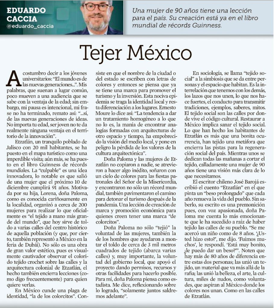 Orgulloso de que mi cuento «Etzatlán«, dedicado a mi esposa, la escritora mexicana Leyda Mariscal, fuera asociado a tan bonita ciudad de Jalisco en la editorial «Tejer México» de Grupo Reforma, a propósito de los hermosos tejidos que allí se confeccionan.