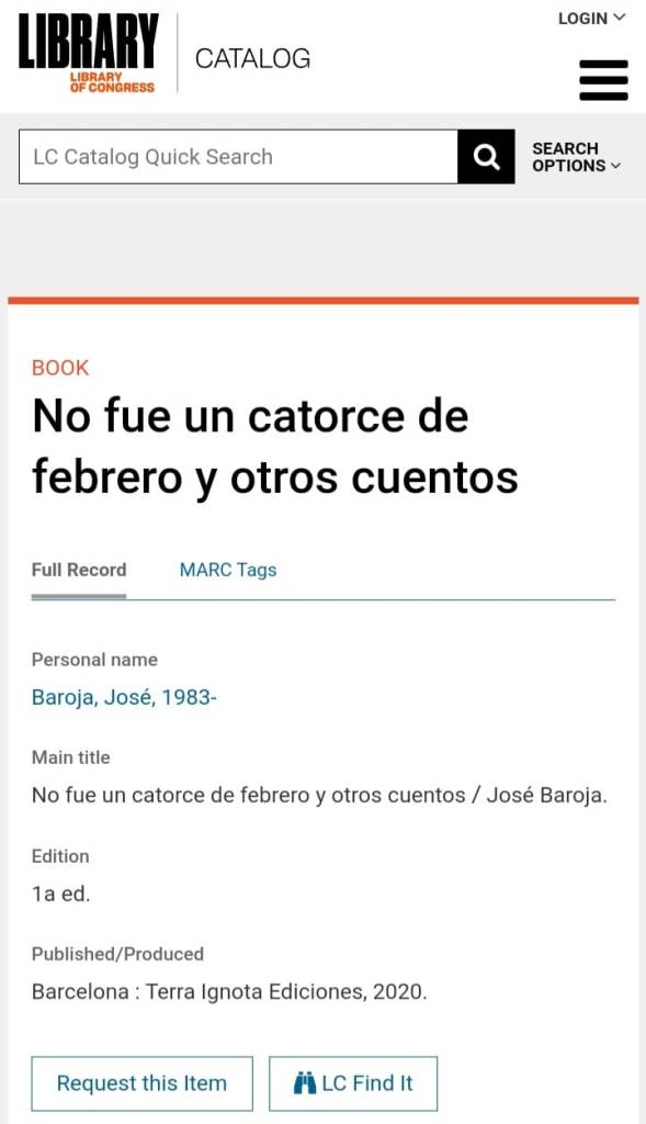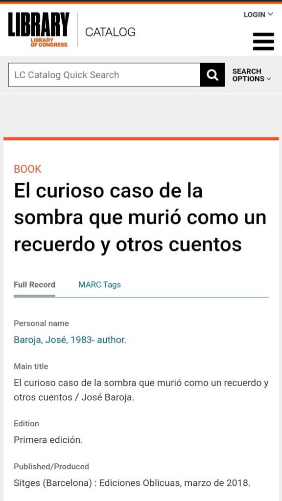 En Library of Congress, en Estados Unidos, ya están disponibles para préstamo y consulta dos de mis libros: No fue un catorce de febrero y otros cuentos y El curioso caso de la sombra que murió como un recuerdo y otros cuentos.