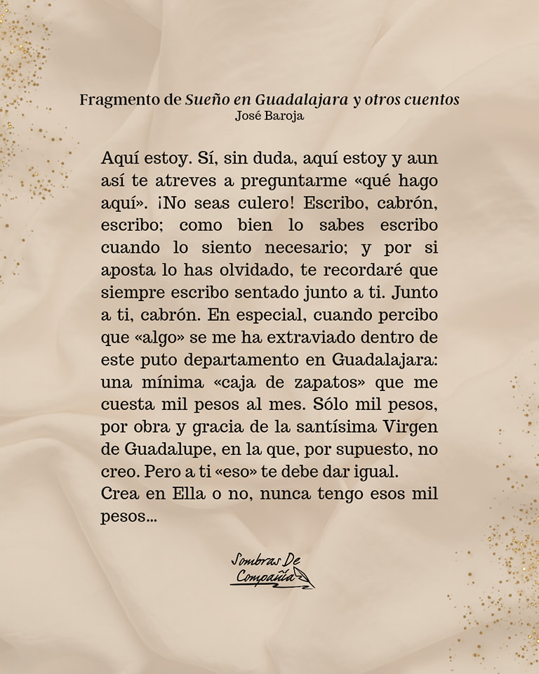 El proyecto «Fragmentos de textos«, dirigido por Fernanda Pérez, ha tenido la gentileza de incluir en sus redes el inicio del cuento «Sueño en Guadalajara» del libro homónimo (Terra Ignota Ediciones: Barcelona, 2023).