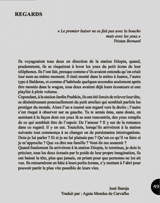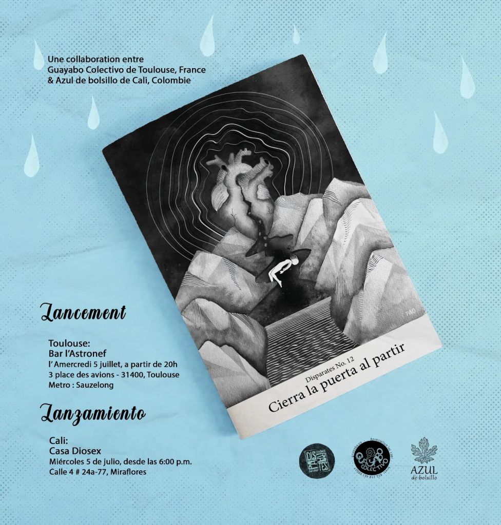 Estoy muy agradecido, por partida doble, ya que Disparates Fanzine, proyecto conjunto entre Asociación Guayabo Colectivo y Azul de bolsillo, editado simultáneamente en Cali, Colombia, y Toulouse, Francia, han tenido la gentileza de incluir en su número 12 mi cuento «Miradas», al tiempo que Agata Mendes de Carvalho se ha encargado de su traducción al francés.