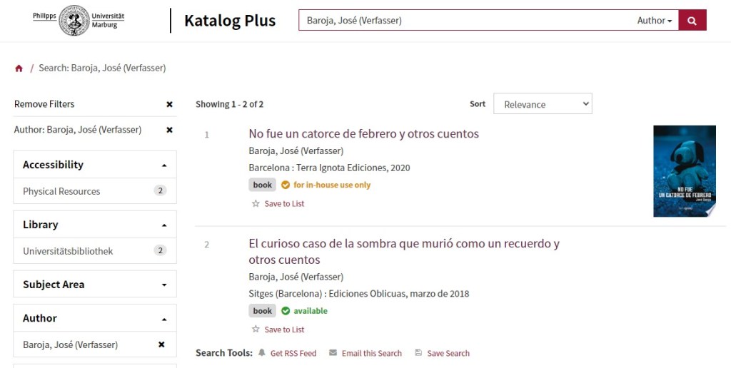 En Universitätsbibliothek Marburg, en Alemania, ya están disponibles para préstamo y consulta dos de mis libros: No fue un catorce de febrero y otros cuentos (TerraIgnota Ediciones: Barcelona, 2021) y El curioso caso de la sombra que murió como un recuerdo y otros cuentos (Ediciones Oblicuas: Barcelona, 2018).
