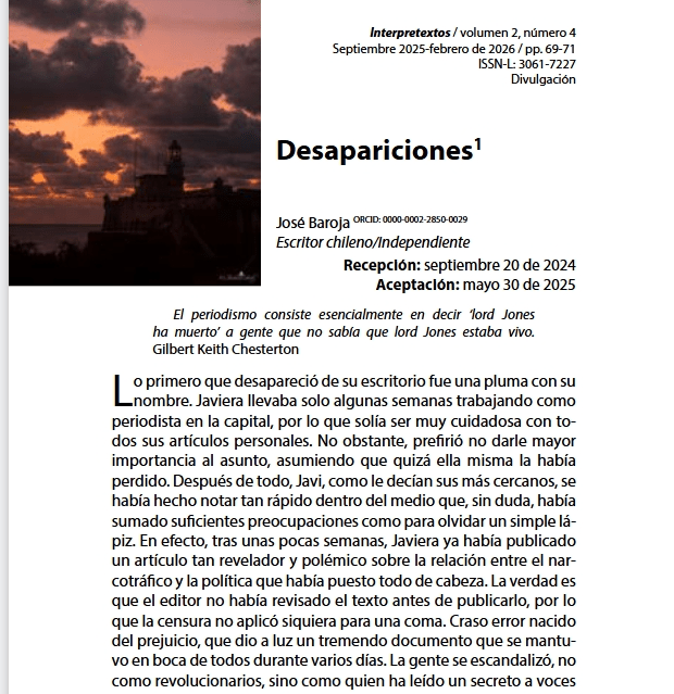 Interpretextos©-Revista semestral de creación y divulgación científica, perteneciente a la Universidad de Colima, ubicada en Colima, México, ha publicado mi cuento «Desapariciones» en su número 4, volumen 2, 2025. Pueden descargar la investigación o la revista completa en los siguientes botones.