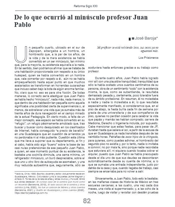 Reforma Siglo XXI (ISSN 2007-2058), revista trimestral editada y publicada por la Universidad Autónoma de Nuevo León a través de la Preparatoria Número 3 ha tenido la gentileza de publicar mi cuento inédito «De lo que ocurrió al minúsculo profesor Juan Pablo«. Puedes descargar la edición número 123, Volumen 32, en los siguientes enlaces.