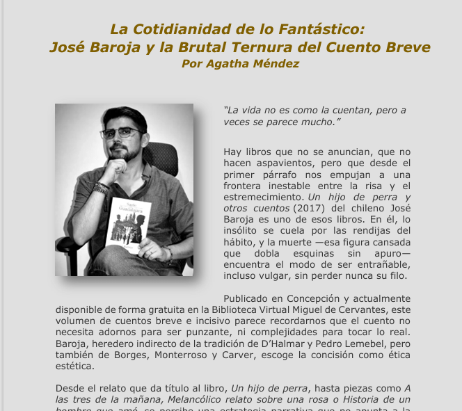 El número 27 de la revista de poesía y artes literarias De Sur a Sur©, proyecto digital de Sur a Sur Ediciones, editado en España, ha publicado una nota acerca de mi trabajo literario, firmado por Agatha Mendes: La Cotidianidad de lo Fantástico: José Baroja y la Brutal Ternura del Cuento Breve.